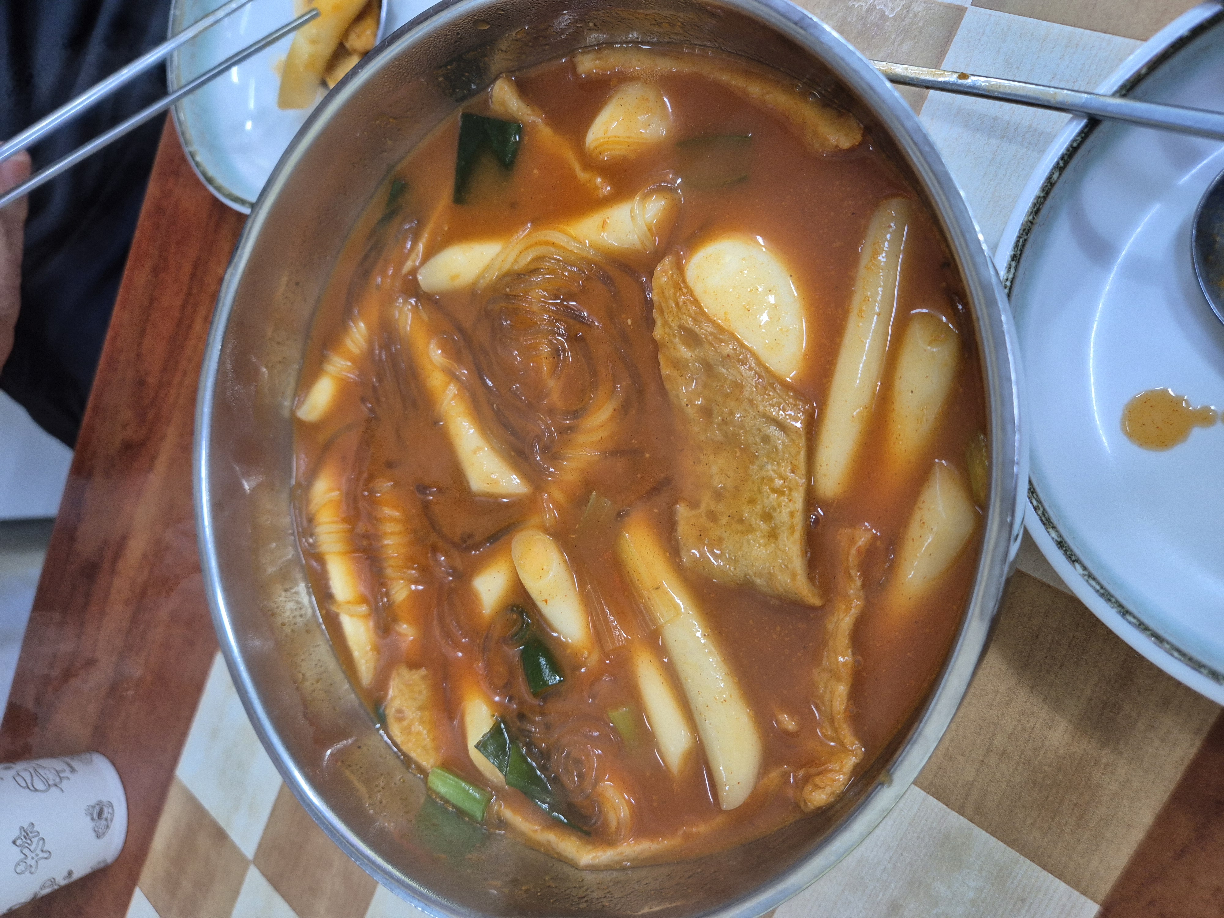 6. 떡이 적당하게 퍼졌을 때 어묵과 썰어 놓았던 대파를 넣어 끓인다.